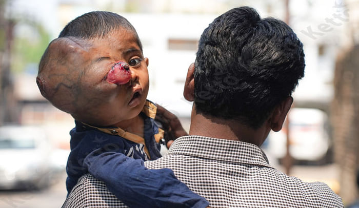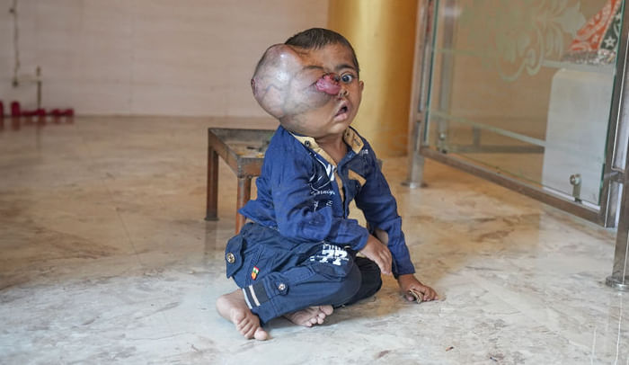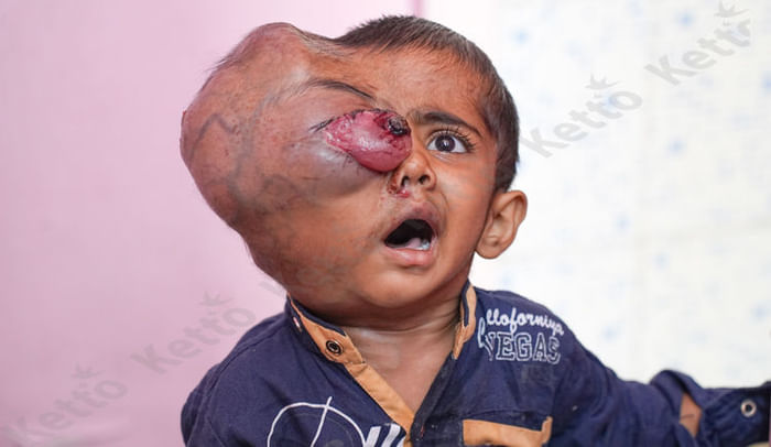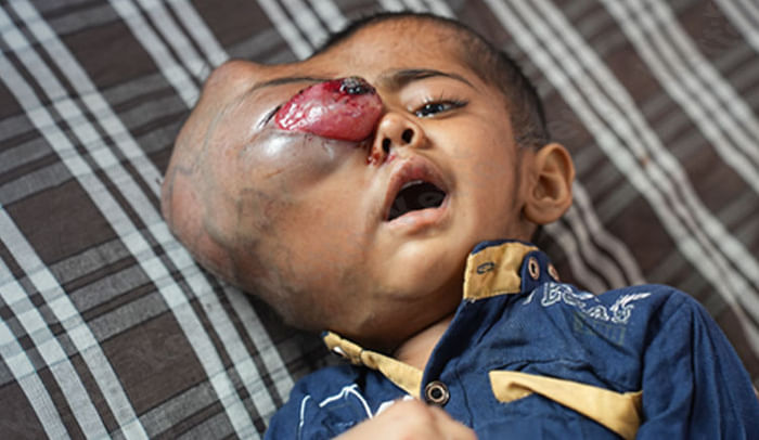 Hasnain has a rare tumor in his eye that's affecting the soft tissue around it. This tumor might also be spreading into his skull. Because of this, his right eye is bulging outwards and to the side.